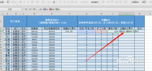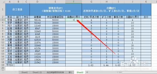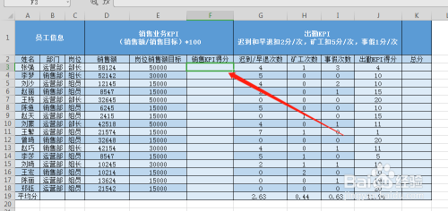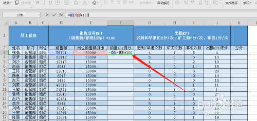 选中出勤KPI得分单位格,输入公式,如图所示,然后再按enter键。