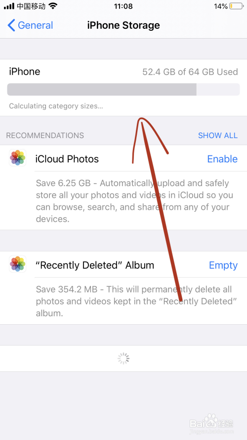 查看iPhone残剩存储空间。