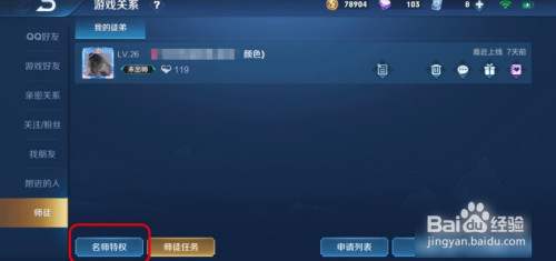 6.在这里,我们能看到本身的门徒。在师徒界面,选择左下方的【名师特权】。