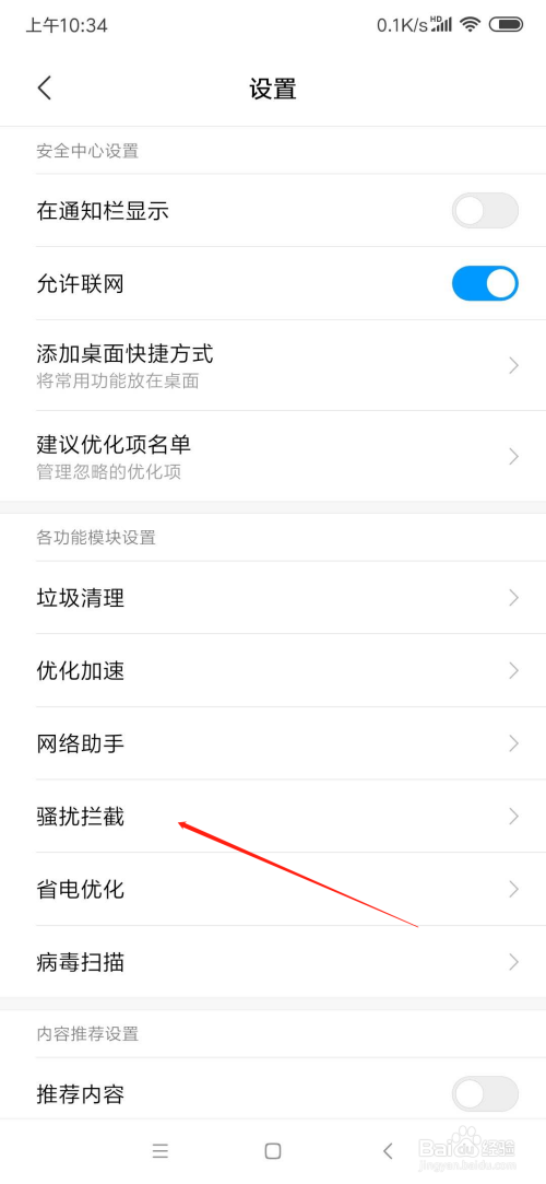 在设置页面中,点击骚扰阻挡
