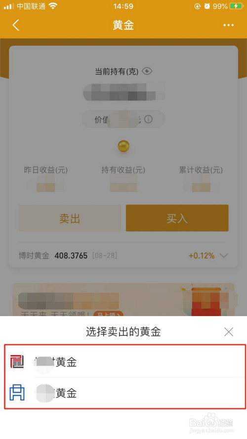 在弹出的“选择卖出的黄金”面板中,选摘要卖出的黄金。