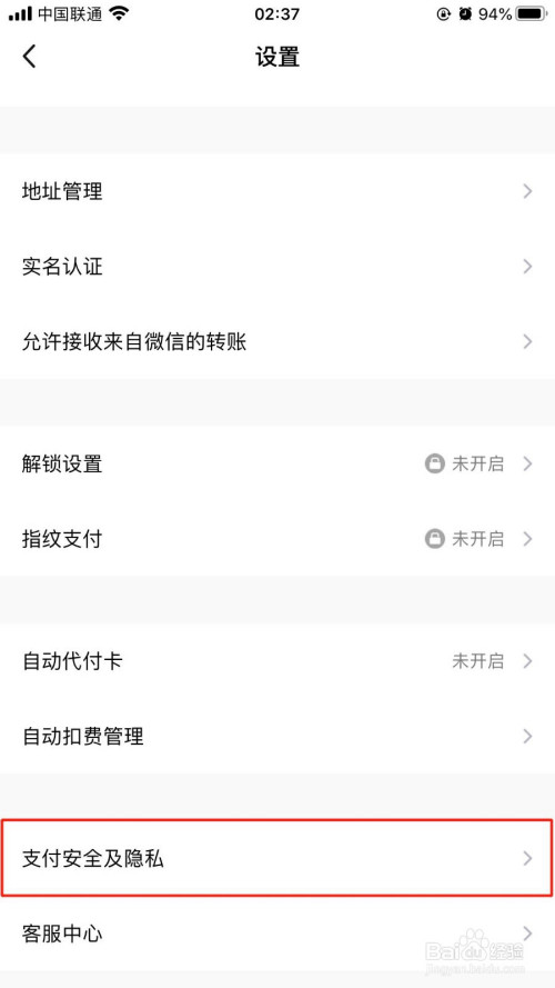 在“设置”界面中,选择“支付平安及隐私”选项。