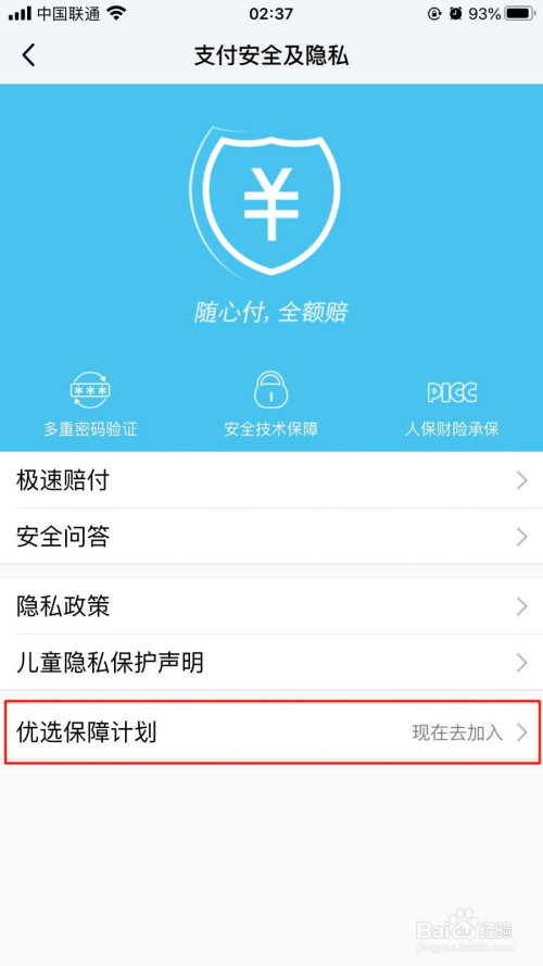 在“支付平安及隐私”页面中,选择“优选保障打算”选项。