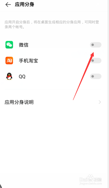 4、点击开启微信应用兼顾右侧开关按钮。
