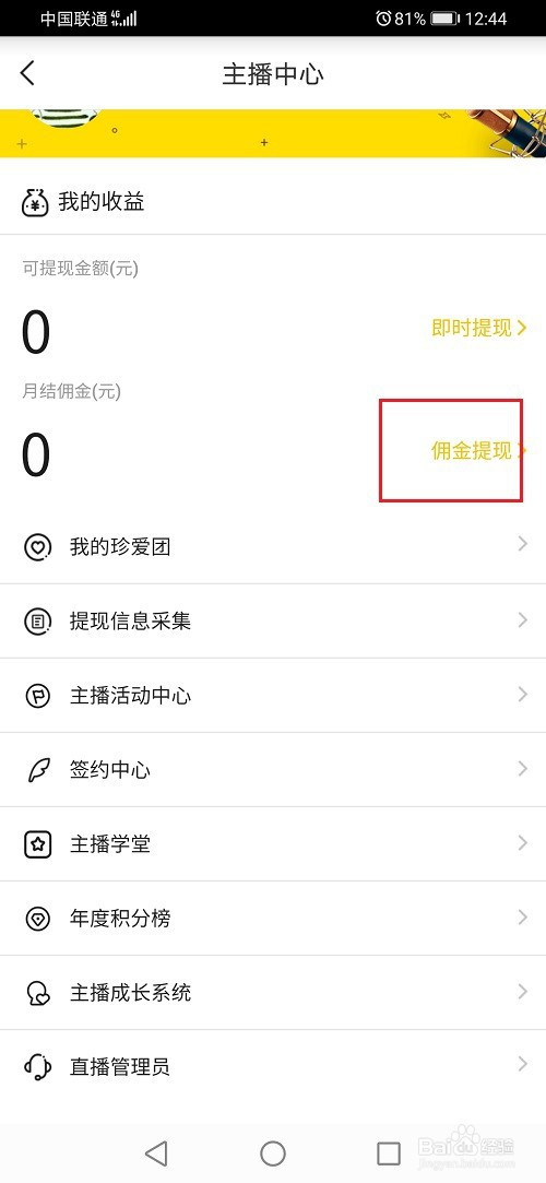 第三步进去本家儿播中间之后,点击佣金提现