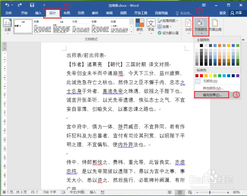 ●依次点击【设计】选项卡>>【页面颜色】>>【填充结果】。