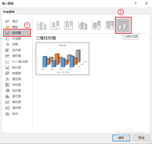 例如点击【柱形图】,然后在右侧的“柱形图”组中点击【三维柱形图】。