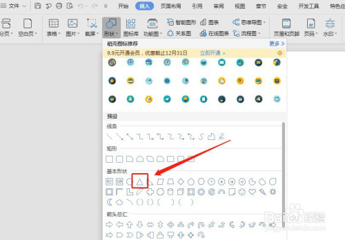 在外形里面找到根基外形里面的等腰三角形图标,单击等腰三角形