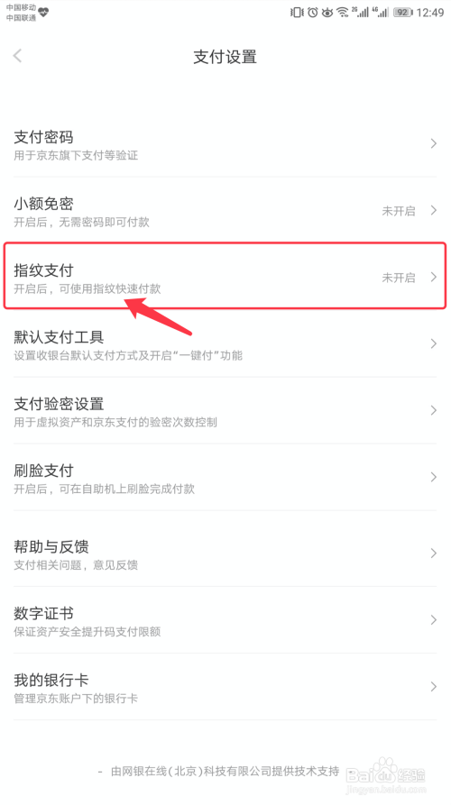在【支付设置】页面中,点击【指纹支付】,如下图所示。
