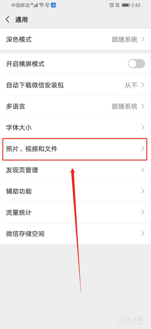 进入“照片、视频和文件”界面后,点击“照片、视频和文件”界面第三行的“视频”,如图