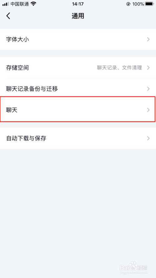 在“通用”界面中,选择“聊天”选项。