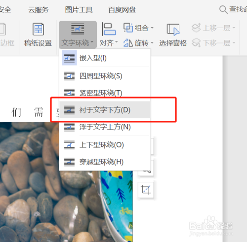 这时我们找到此中的“文字环抱”,然后点击此中的如下图所示的按钮就可以点窜为“衬于文字下方”啦