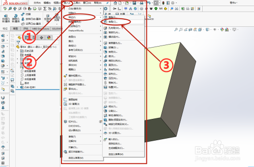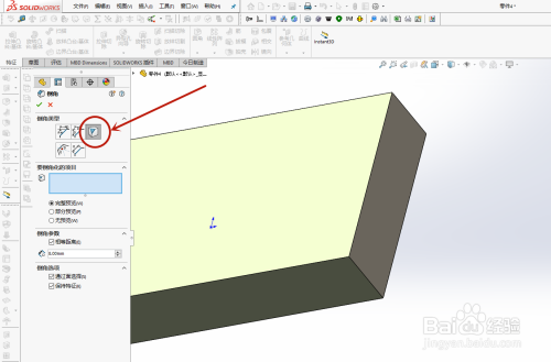 第一步:打开需要倒角的Solidworks三维模子;按照图片箭头指示的图标,点击打开“倒角”功能