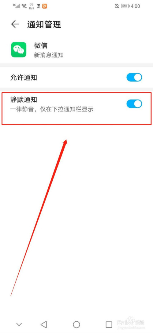 如图白色圆圈标的目的右移动且灰色区域酿成蓝色区域即暗示完当作微信开启静默通知