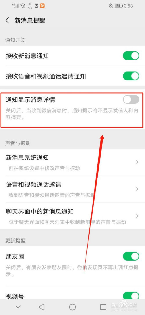 进入“新动静提醒”界面后,点击“新动静提醒”界面第三行的“通知显示动静详情”右边绿色区域的白色圆圈,如图