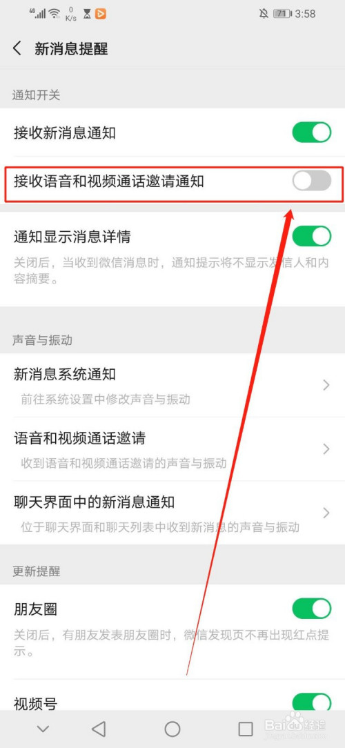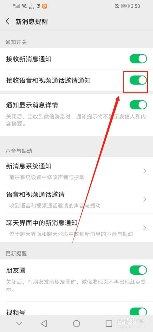 进入“新动静提醒”界面后,点击“新动静提醒”界面第二行的“接收语音和视频通话邀请通知”右边绿色区域的白色圆圈,如图