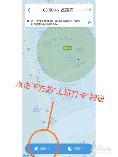 进入到这个界面,会有一副定位地图,很精确。就可以进行上班打卡定位了。