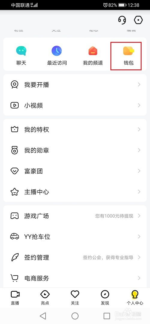第一步打开yy,进去小我中间之后,点击钱包