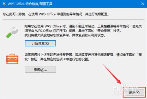 开启模板保举后,返回“WPS Office综合修复/设置装备摆设东西”界面,点击“退出”按钮即可。见下图