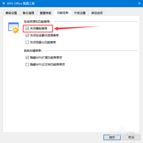 【6】打开“功能定制”选项卡后,点击“在线资本和功能保举”下的“封闭模板保举”或前面方框,把方框中的勾打消失落。