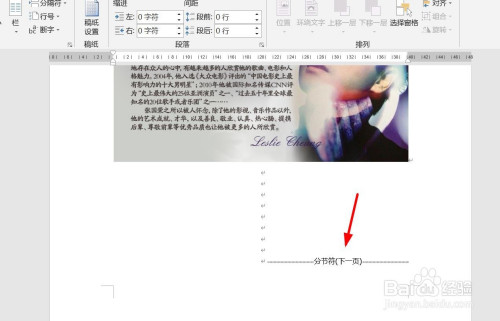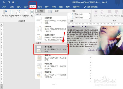 打开word文档,在设置页码的前一页(这里为第一页),鼠标点击最后的回车符号。然后点击“结构”-分节符-下一页。