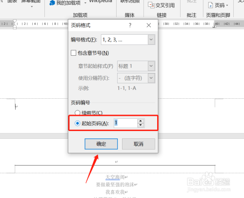 点击“插入”-“页码”-“设置页码格局”,在页码编号一项,选为“肇端页码”。点击确定。