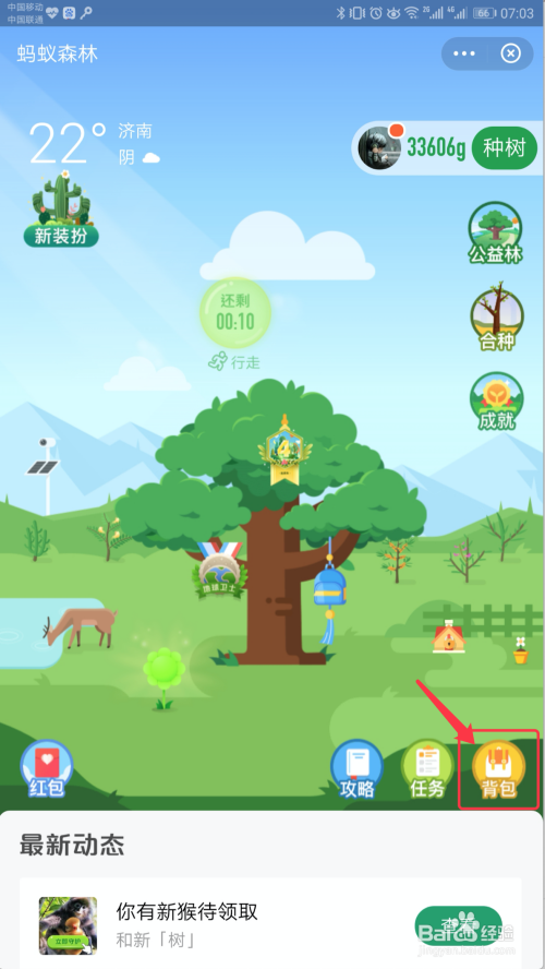 在【蚂蚁丛林】中,点击【背包】,如下图所示。
