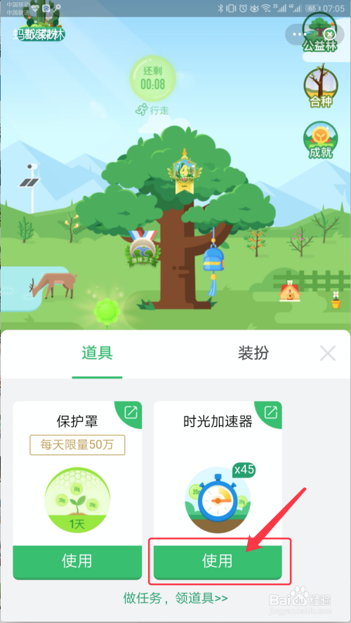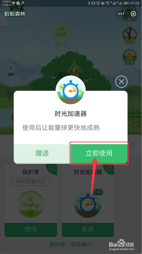总结:打开「支付宝」- 点击【蚂蚁丛林】- 点击【背包】 - 点击【道具】、【光阴加快器】、【利用】- 点击【当即利用】- 加快当作功,收取能量。