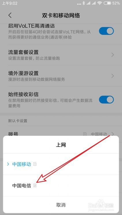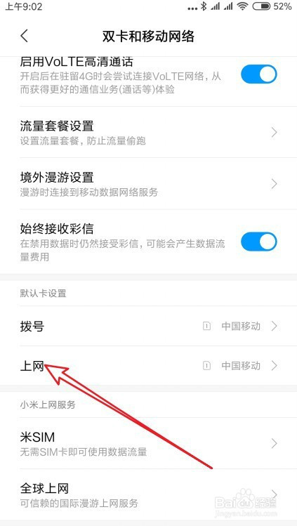 然后在打开的设置页面,点击双卡和移动收集的设置项。