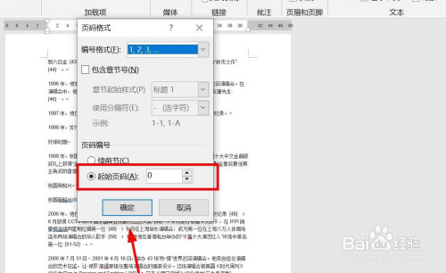 点击“页码”——“设置页码格局”,点击肇端页码,把数字改为0,点击确定。