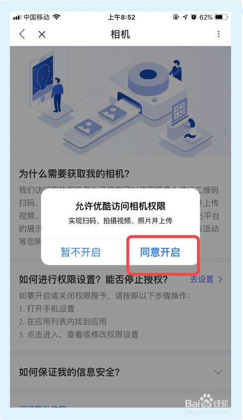6.在接下来的界面,点击【赞成开启】选项,完当作以上步调优酷app即可开启许可优酷拜候相机权限功能。