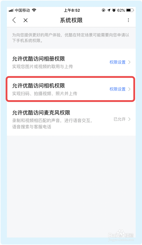 5.在【系统权限】界面,点击【许可优酷拜候相机权限】;