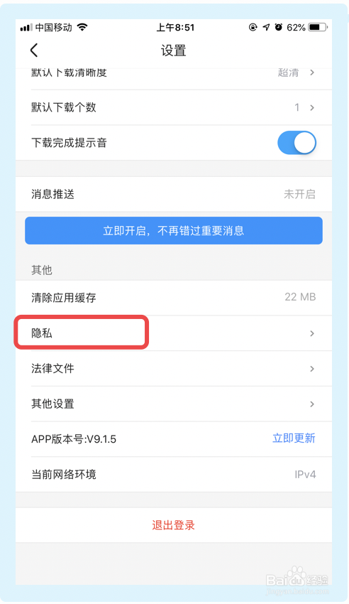 3.在【设置】界面,点击【隐私】;