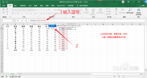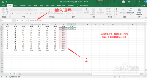 第三步:英文法输入逗号【,】离隔,再框选【数据区域】(例如H3:H11所有成就总分)