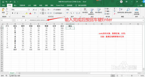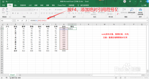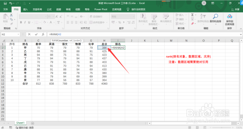第二步:点击一个作为排名对象的【单位格】(例如甲的总分,单位格为H2)
