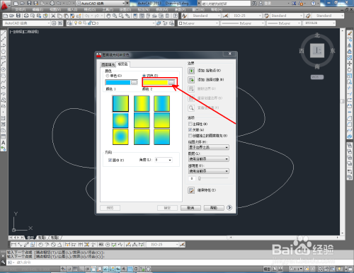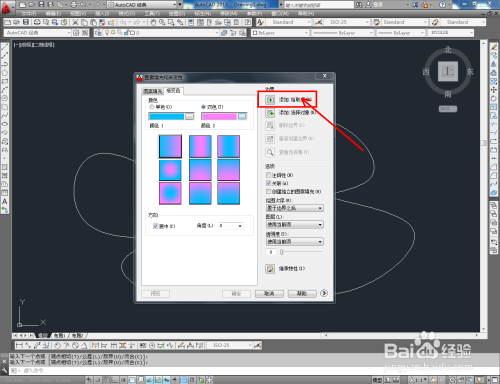 勾选【双色】,按图示设置好颜色1和颜色2后,点击【添加拾取点】并点击拾取曲线图案;