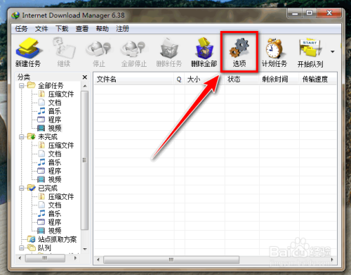 打开IDM下载软件,点击东西栏上的“选项”按扭。