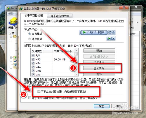 先点击“全数断根”,再勾选“不要从在线播放器中主动捕捉并下载文件”。