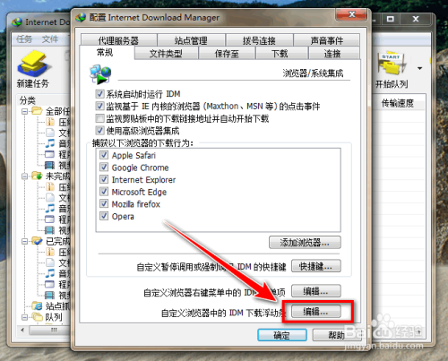 点击“自界说浏览器中的IDM下载浮动条”右边的编纂按扭。