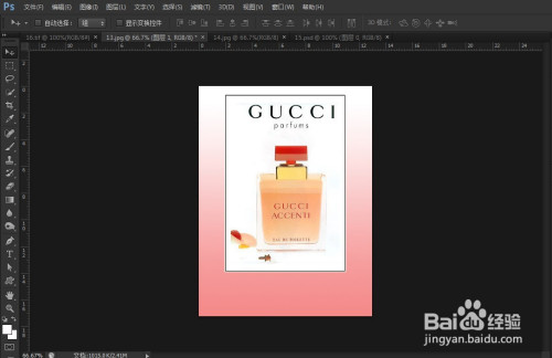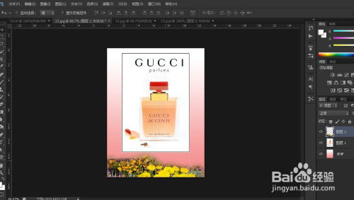 切换15、psd图像中,然后操纵移动东西将花朵拖动到13、jpg图像中,并如下图放置。