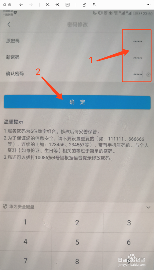 在【密码点窜】页面,输入【原密码】和2次【新密码】后,点解【确定】按钮,如下图所示。