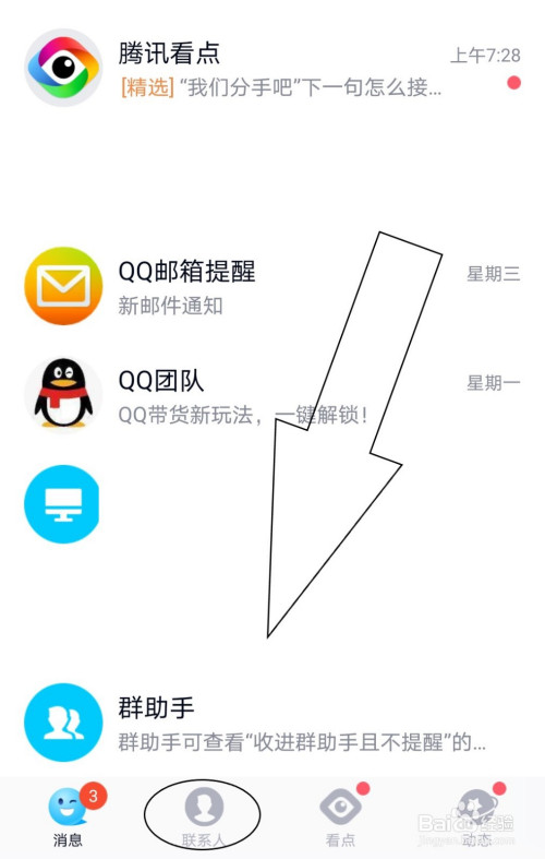 点击进入QQ,找到“联系人”功能。