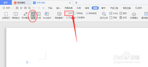 【4】接着,在“页面”模式下,点击“标尺”或标尺前的方框,使在方框中打上勾。