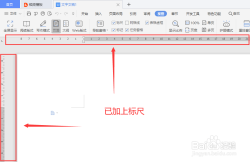 【5】把标尺勾选上后,在编纂页左边和顶部将会显示标尺。