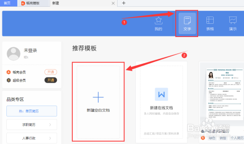 在“新建”界面,点击导航栏上的“文字”,接着点击“+ 新建空白文档”。见下图