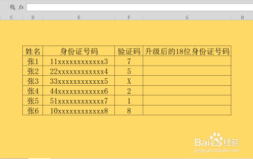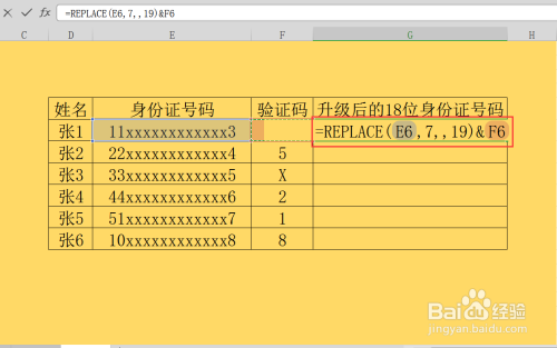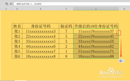 第五步,录入函数后,我们双击单位格,利用拼接符,将验证码列拼接在新身份证号码的后方;