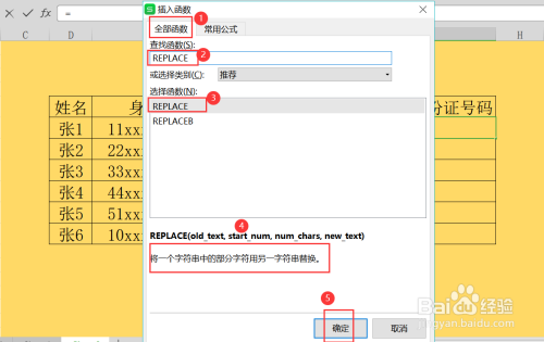 第三步,在插入函数页面,查找REPLACE函数,点击确定,该页面可以看到函数的利用法则,详情如下;