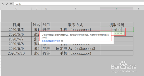 第二步,要提取联系体例列中的德律风号码,需要用到MIDB、SEARCHB、LEN三个函数,首先我们在单位格中输入=MIDB,领会其用途;