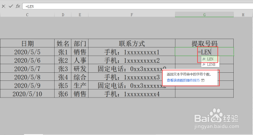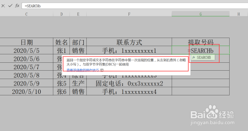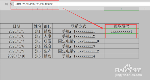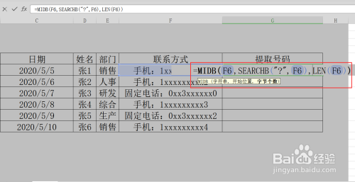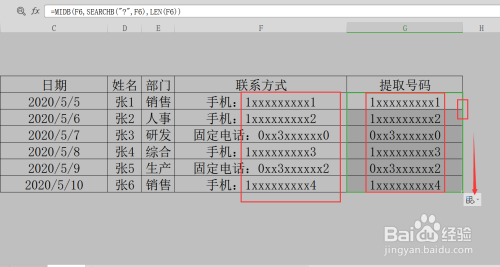 第五步,领会完函数的利用功能后,我们在G6单位格中输入计较公式=MIDB(F6,SEARCHB("?",F6),LEN(F6)),意为截取单位格中属于德律风号码部门的信息;
