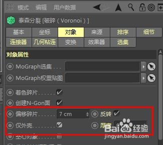 再在破裂属性中选择“对象”通道,将“偏移碎片”的数值点窜为7片,这样就增添了碎片之间的距离,有了镂空的初步雏形。同时勾选后面的“反转”及“仅外壳”选项。
